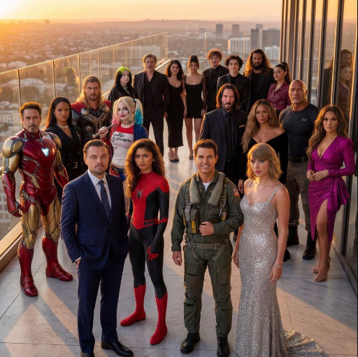 Create a hyper-realistic, ultra-sharp, full-color large-format image featuring a massive group of celebrities from different eras, all standing together in a single wide cinematic frame. The image must look like a perfectly photographed editorial cover with impeccable lighting, lifelike skin texture, micro-details of hair, pores, reflections, and fabric fibers. GENERAL STYLE & MOOD: Photorealistic, 8k, shallow depth of field, soft natural fill light + strong golden rim light. High dynamic range, calibrated color grading. Skin tones perfectly accurate. Crisp fabric detail with individual threads visible. Balanced composition, slightly wide-angle lens (35mm), center-weighted. All celebrities interacting naturally, smiling, posing, or conversing. Minimal background noise, but with enough world-building to feel real. THE ENVIRONMENT: A luxurious open-air rooftop terrace at sunset overlooking a modern city skyline. Elements include: Warm golden light wrapping around silhouettes. Polished marble.