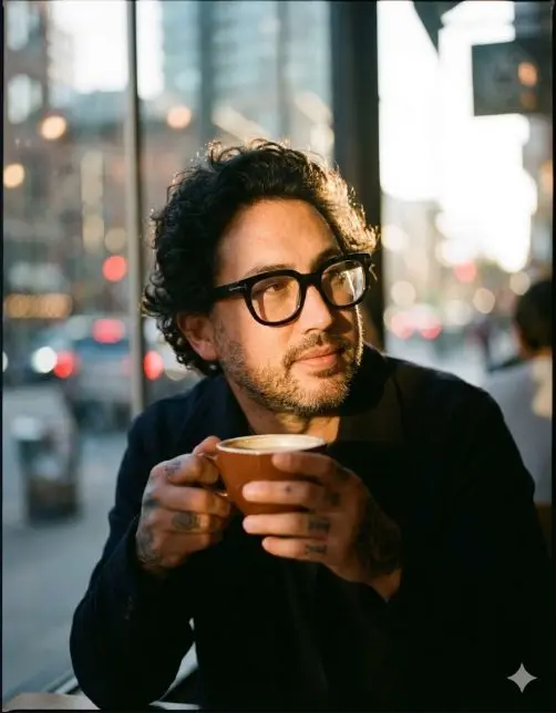 Keep the facial features of the person in the uploaded image exactly consistent . Style : A cinematic, emotional portrait shot on Kodak Portra 400 film . Setting : An urban street coffee shop window at Golden Hour (sunset) . Warm, nostalgic lighting hitting the side of the face. Atmosphere : Apply a subtle film grain and soft focus to create a dreamy, storytelling vibe. Action : The subject is looking slightly away from the camera, holding a coffee cup, with a relaxed, candid expression. Details : High quality, depth of field, bokeh background of city lights.