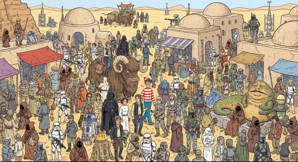 A where is waldo image showing all Star Wars characters on Tatooine First one to pull this off. First take. Even Waldo is there.