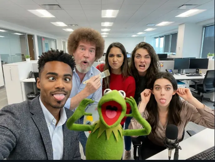 an office team photo, everyone making a silly face