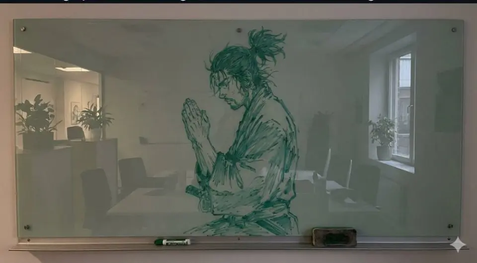 Create a photo of vagabonds musashi praying drawn on a glass whiteboard in a slightly faded green marker