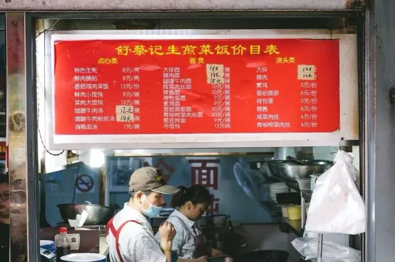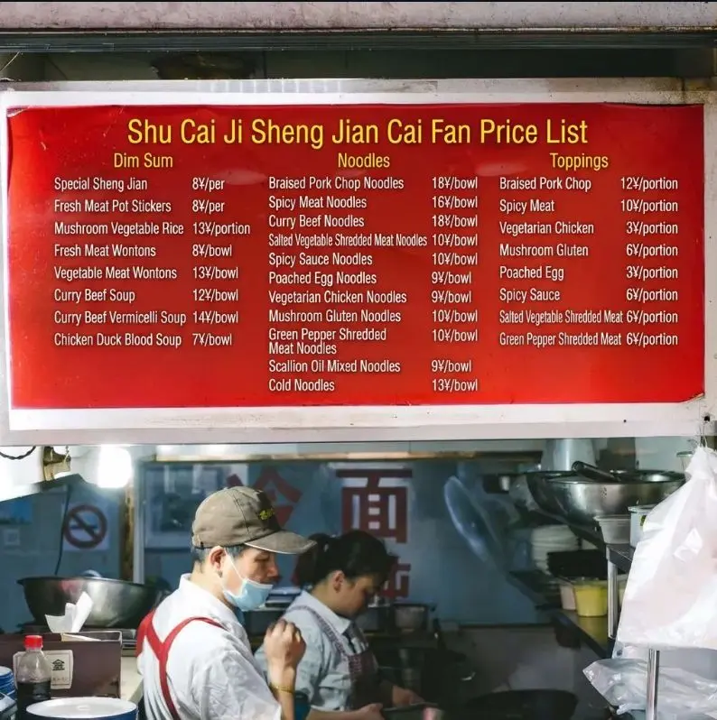 Translate the Chinese dish names on the wall menu into English for foreign tourists. Texture Preservation : Crucial! Maintain the original aged, greasy, and textured look of the wall/paper. The new English text should look like it was written/printed on the same surface, with slight fading or wear to match. Currency : Keep the '¥' symbol and price numbers exactly as they are ; do not convert currency. Layout : align the English translations next to or replacing the Chinese characters naturally.