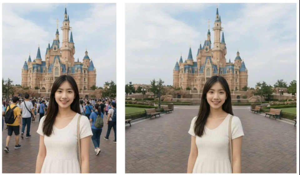 Remove all the tourists/people in the background behind the main subject. Intelligent Fill : Replace them with realistic background elements that logically fit the scene (e.g., extend the cobblestone pavement, empty park benches, or grass textures). Consistency : Ensure no blurry artifacts or 'smudges' remain. The filled area must have the same grain, focus depth, and lighting as the rest of the photo.